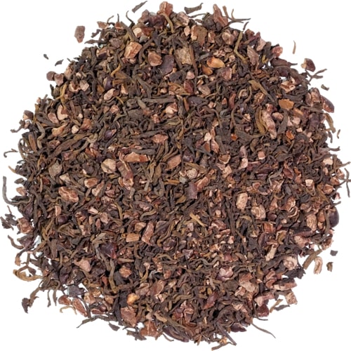 Cooked Pu'Erh is blended with cocoa nibs to create a rich, sweet, full-bodied tea packed with the always popular chocolate flavor.