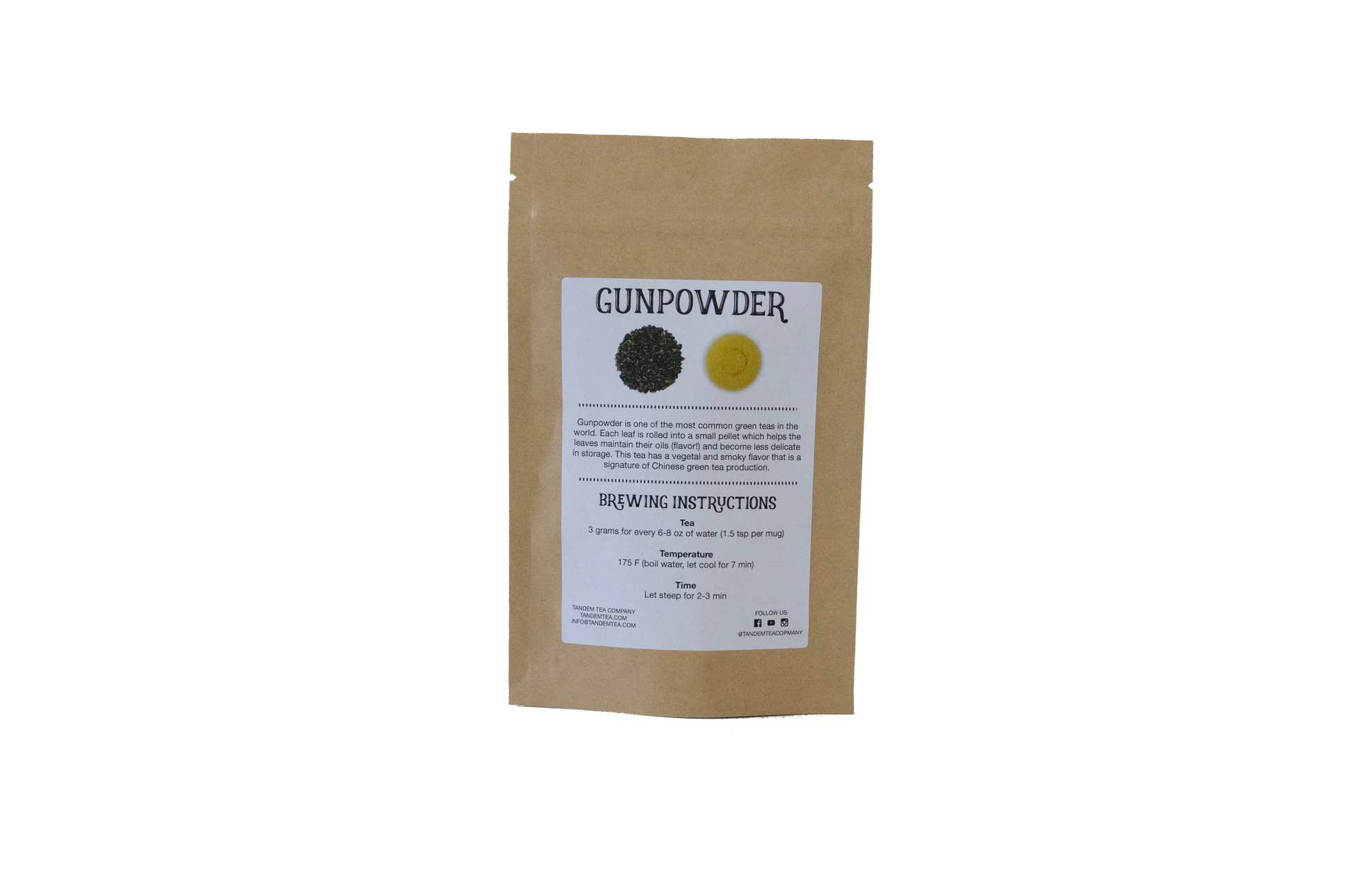Gunpowder is one of the most popular green teas there is. Each leaf is rolled into a small pellet which helps the leaves maintain their oils (flavor!) and become less delicate in storage. This tea has a vegetal and smoky flavor that is a signature of Chinese green tea production.